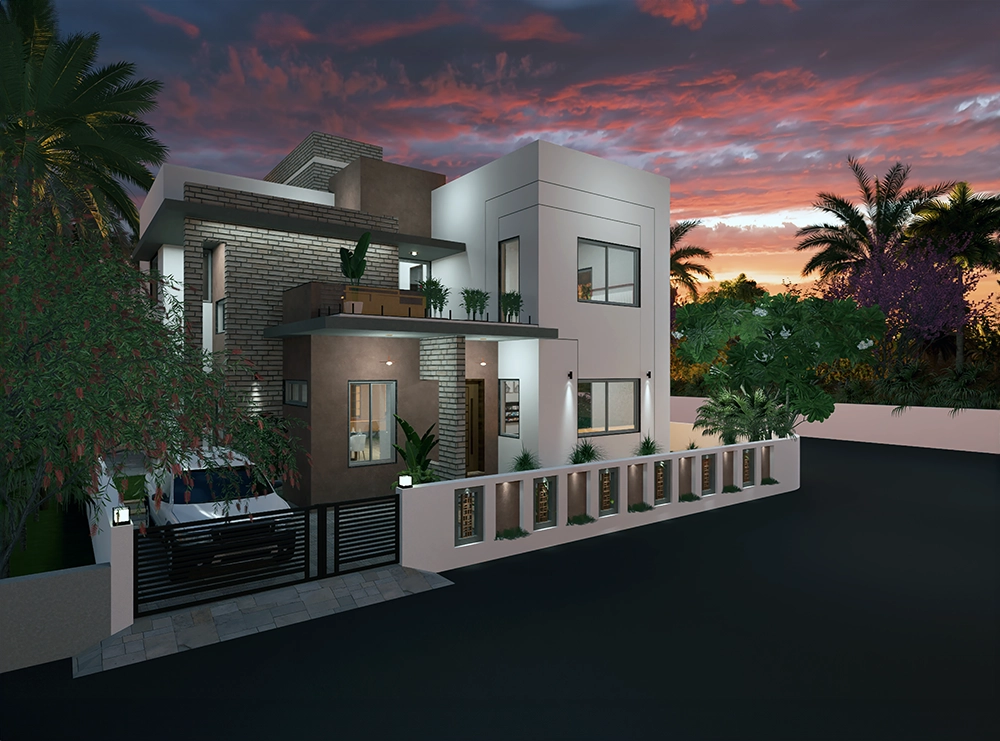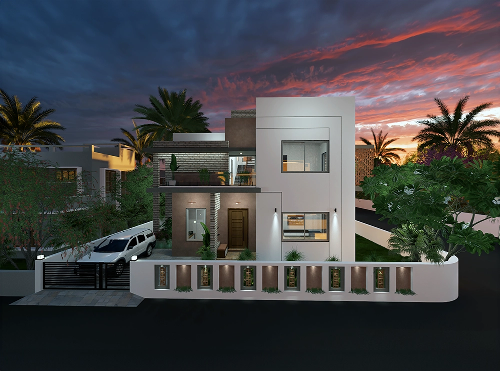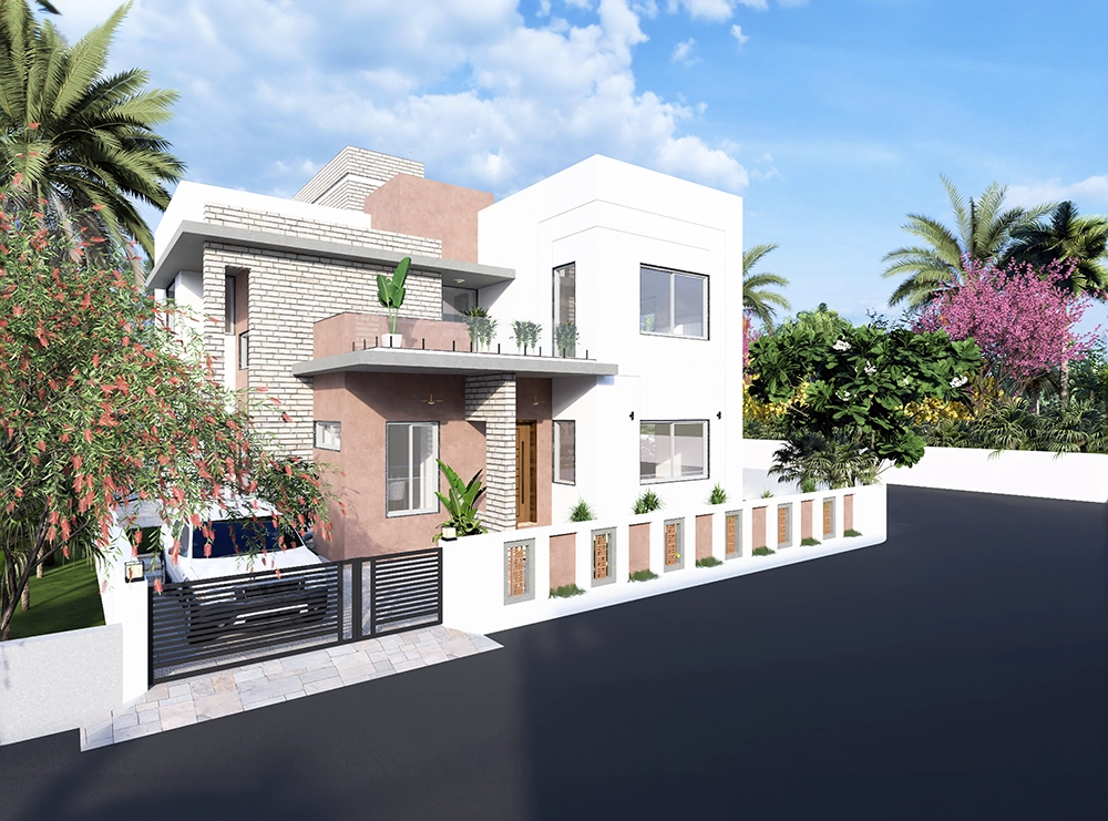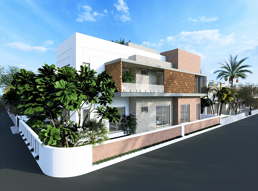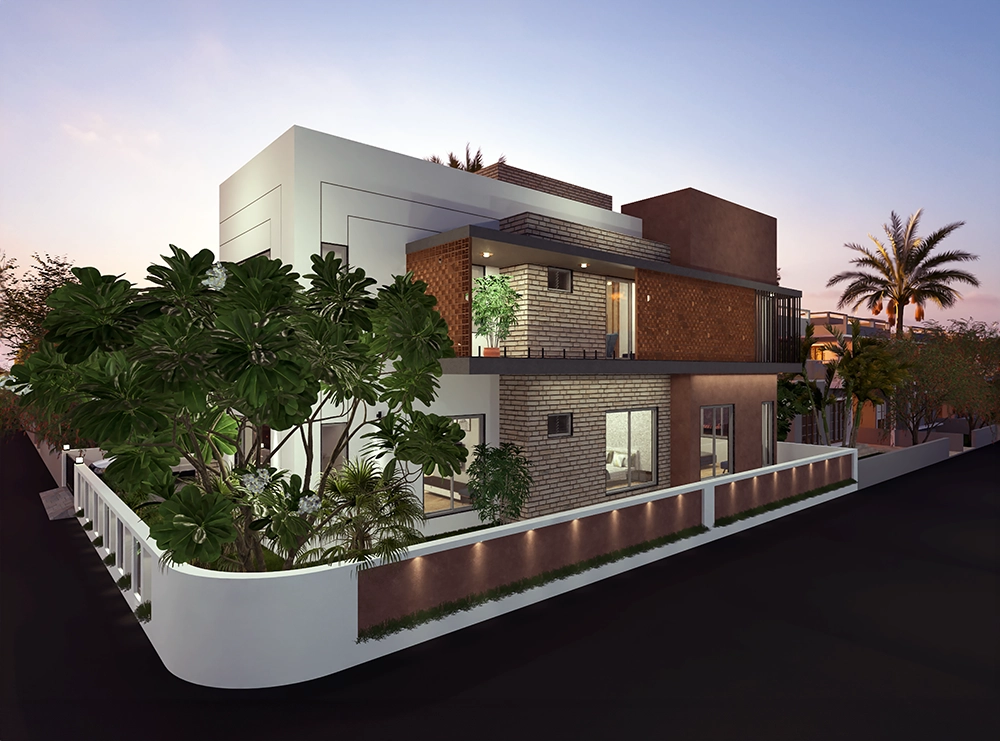 The client desired a 5bhk home flooded with natural light. To meet this, we integrated several open-to-sky areas within the house, such as the puja room, the double-height dining space, and the central atrium serving as the family seating area. Given the plot's exposure to the south-west, we incorporated terracotta jali and metal grill elements into the balcony elevation to shield the house from intense sunlight.