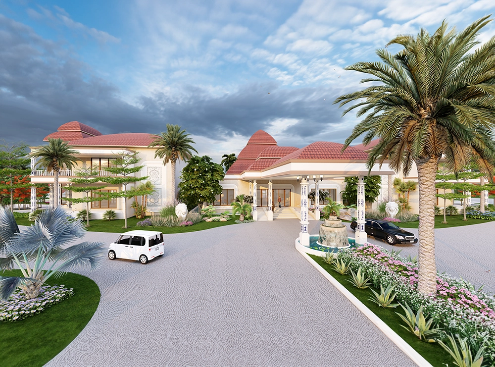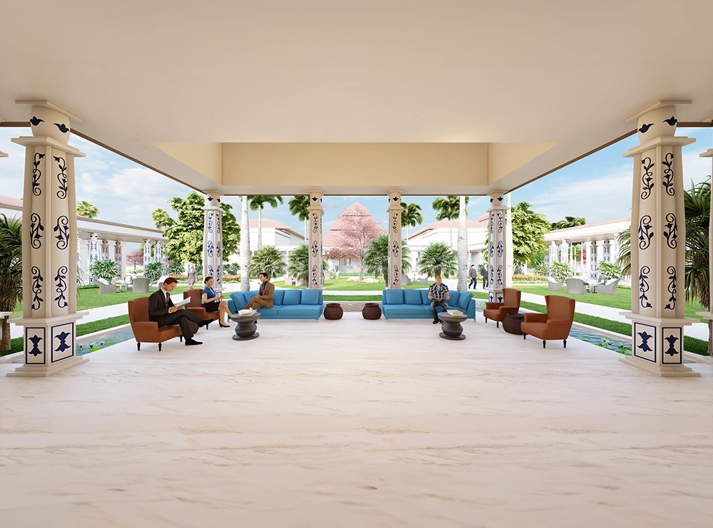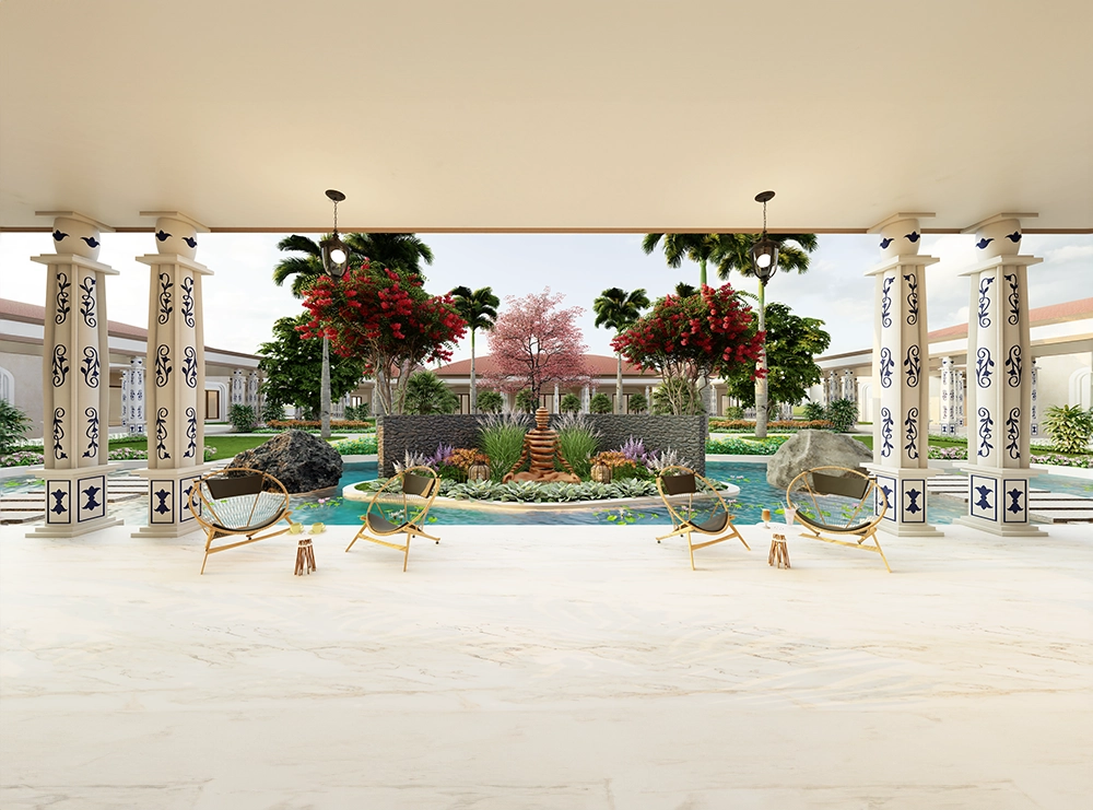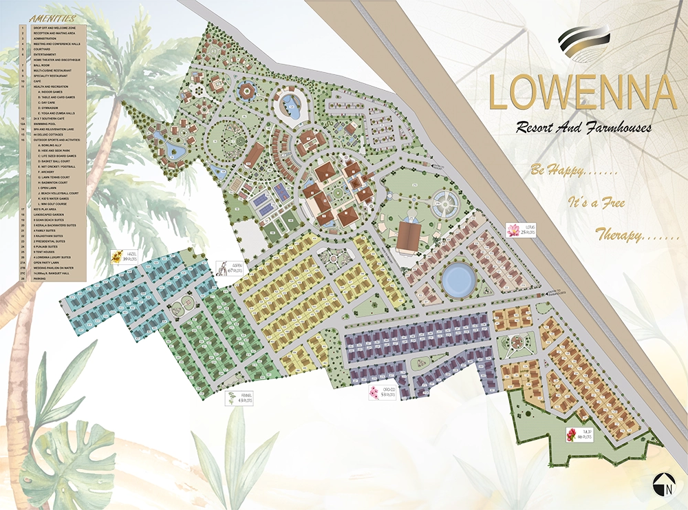The health and recreation Building on the Other side the extravagant swimming pool giving a direct view to the spa and Rejuvenation Lake at the farthest end of the axis. The health and recreation Building has the beautiful cluster of the Deluxe Cottag- es(44) on the left, giving each cottage a stunning view to the garden; while on the right resides the Southern Café. The path to the pool branches out through the ravishing gardens to the forest of camping tents(9) and Lowenna Luxury Suites(4) on the right and to the left one reaches the themed cottages of the Alleppey Backwaters(5), the Beaches of Goa(8), the Sandunes of Rajasthan(5), and the Large Fields of Apna Punjab(6). Amongst these lie beautiful Family Cottages (4) and the Presidential Suites. The Branched Paths are shaded by various fragrant trees of the surrounding land- scape, making one’s journey through the Resort Pleasant and Engrossing. The Beguiling Landscape covers the resort with lush colored and fragrant plants making its each part worth scouting for, including the play areas for children as well as the Large open field for outdoor activities and courts for recreation.