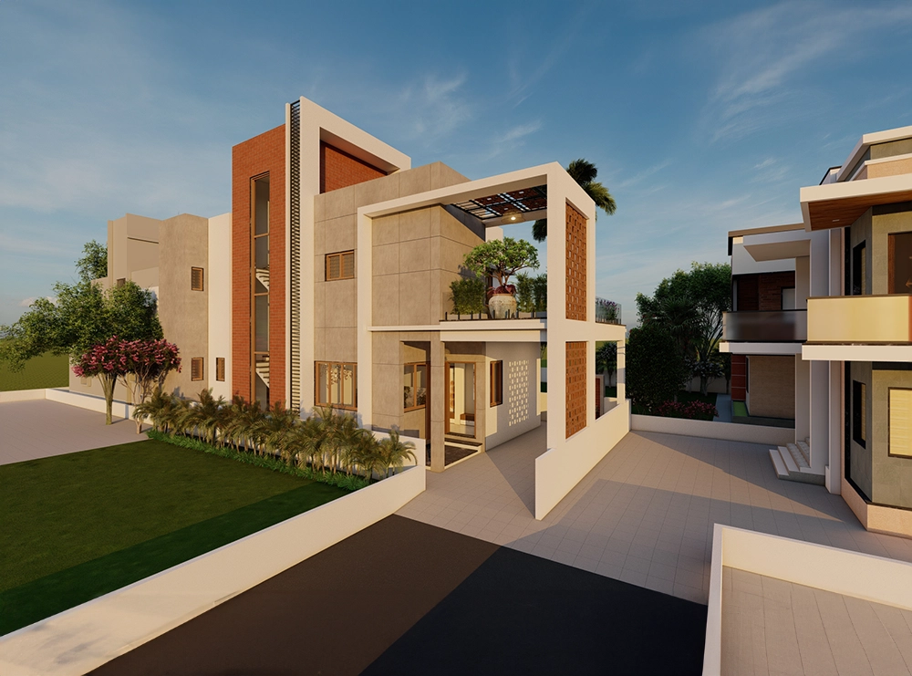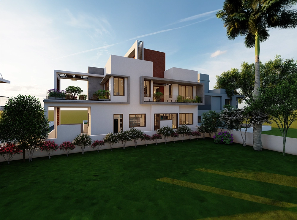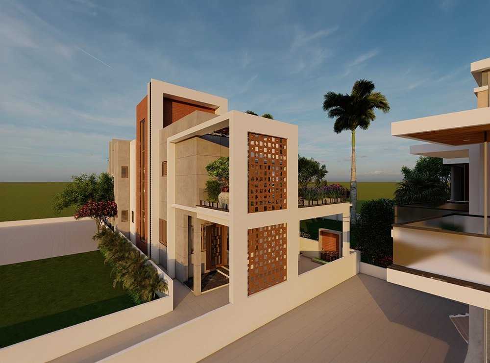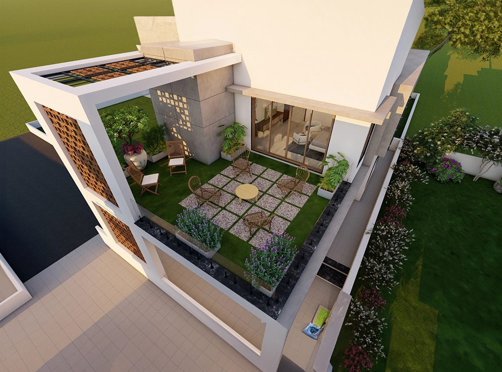 The Design of the House Defines the Play of natural Light while Screening the South West Facing Home from the Harsh Sunlight. The Clients wish to Have a garden was fulfilled by the large terrace garden.