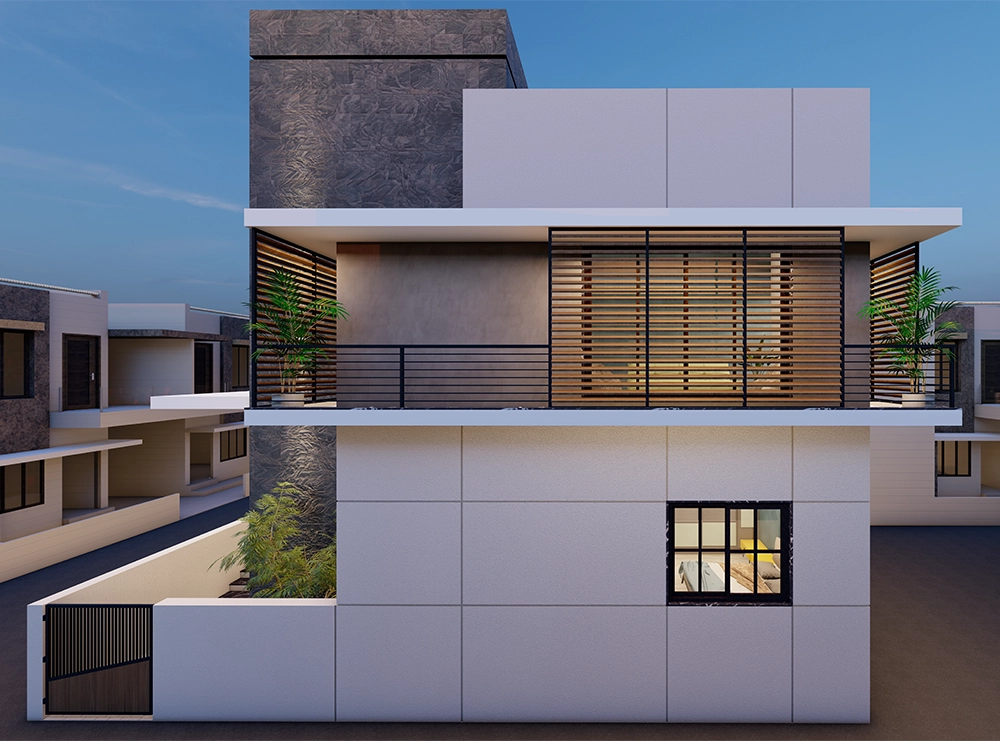 The design for this compact village house fulfills the client’s requirement for privacy with metal louvres adding to the elevational beauty of the house.