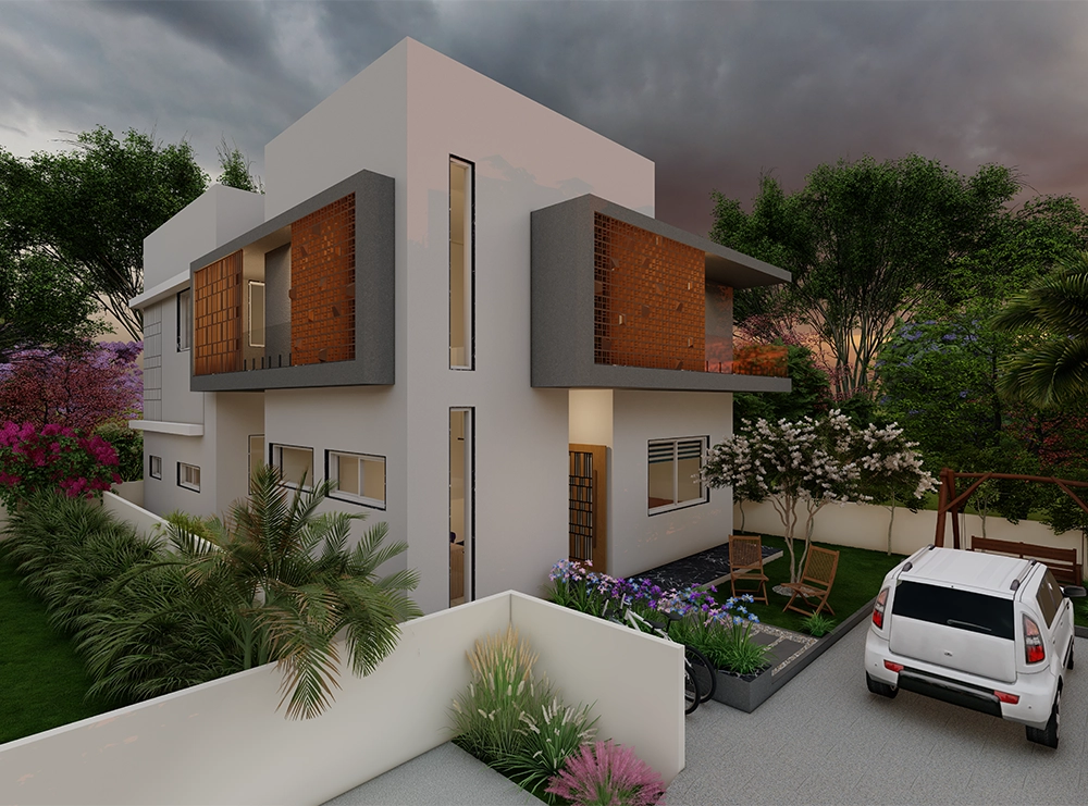 The client’s profession required a home office and their religious beliefs had certain specific requirements for their spacious Puja Room. Metal Jalis Adorn the Balcony Elevation while providing for the Privacy of the User. The Beautiful Garden in the Front yard with a cozy Swing creates the perfect place for the evening tea.